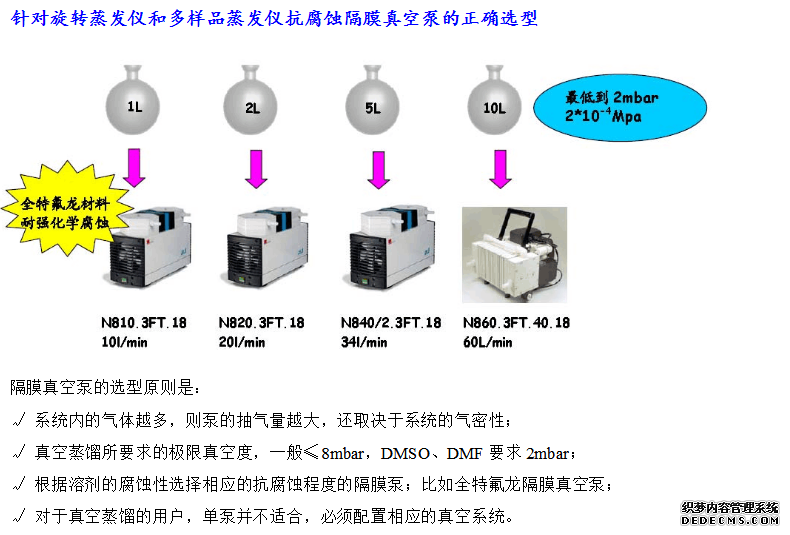 答:旋轉(zhuǎn)蒸發(fā)儀、多樣品蒸發(fā)儀需要配真空泵才能使用,一般以水循環(huán)真空泵和隔膜泵較常見,而油泵較少見。隔膜泵比水循環(huán)真空泵可達到更高的真空度,因此水循環(huán)真空泵在蒸餾高沸點溶劑時很慢,如有機實驗室常用的DMSO。KNF全特氟龍隔膜真空泵抗強化學(xué)腐蝕,如HCl、HNO3、HF、甲苯、氯仿等所有化學(xué)物,且能完全回收,不會飄散出去污染環(huán)境和影響健康。在歐盟G家出于對環(huán)境保護的考慮,已禁止使用水循環(huán)真空泵;而在日本則立法強制要求廢水處理達標(biāo)后才能排放。因此樣品內(nèi)含有機溶劑,建議用隔膜泵較好。