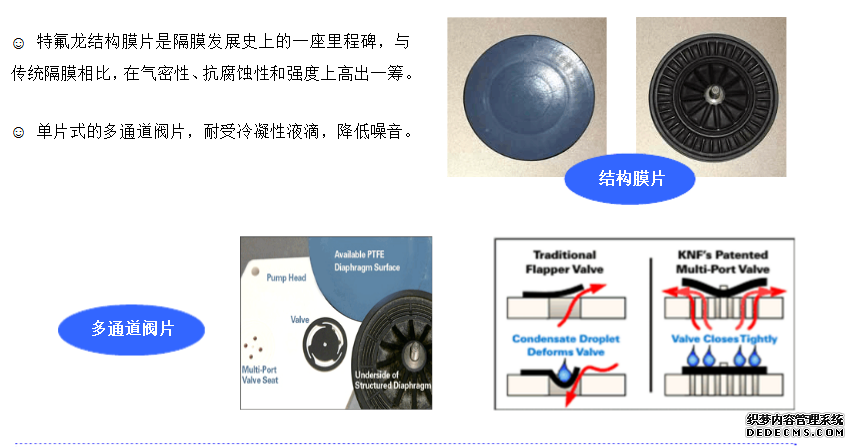 多通道特氟龍閥片特氟龍泵頭 答:一個安裝在偏心曲軸上的彈性膜片(見圖)在電機的帶動下做上下往復(fù)運動,使得腔體發(fā)生形變,實現(xiàn)介質(zhì)的抽入和排出。泵在轉(zhuǎn)移,疏散及壓縮的過程完全無油,實現(xiàn)無污染傳輸。