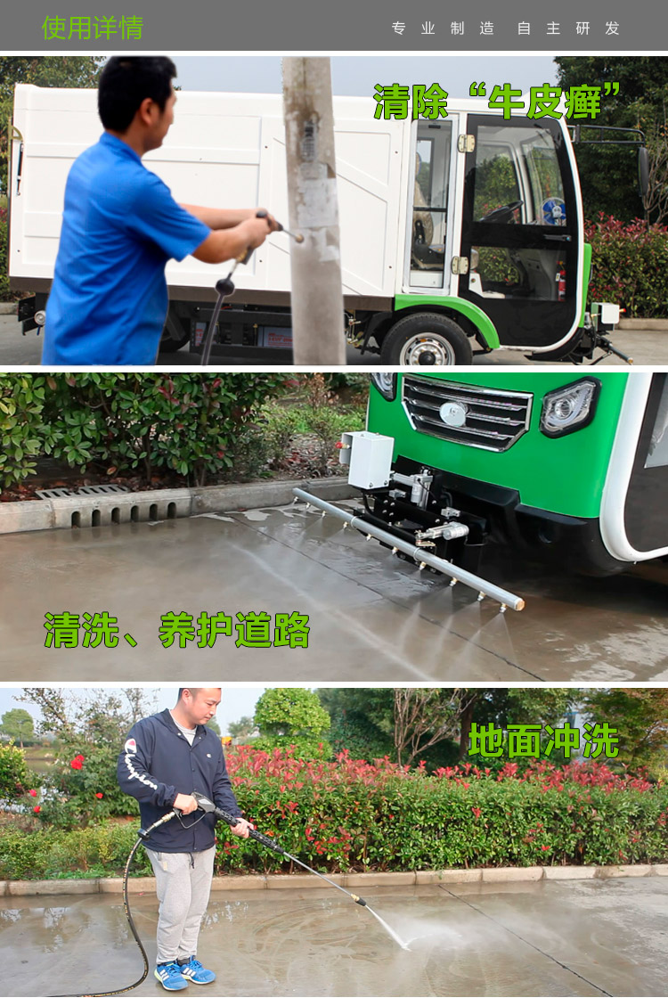 四輪路面養護MN-H51配備噴水槍,主要用于清除城市中“牛皮癬”、小廣告、道板、護欄、路崖的死角等部位和路邊攤地面油污,也可用于消毒和噴灑農藥。
